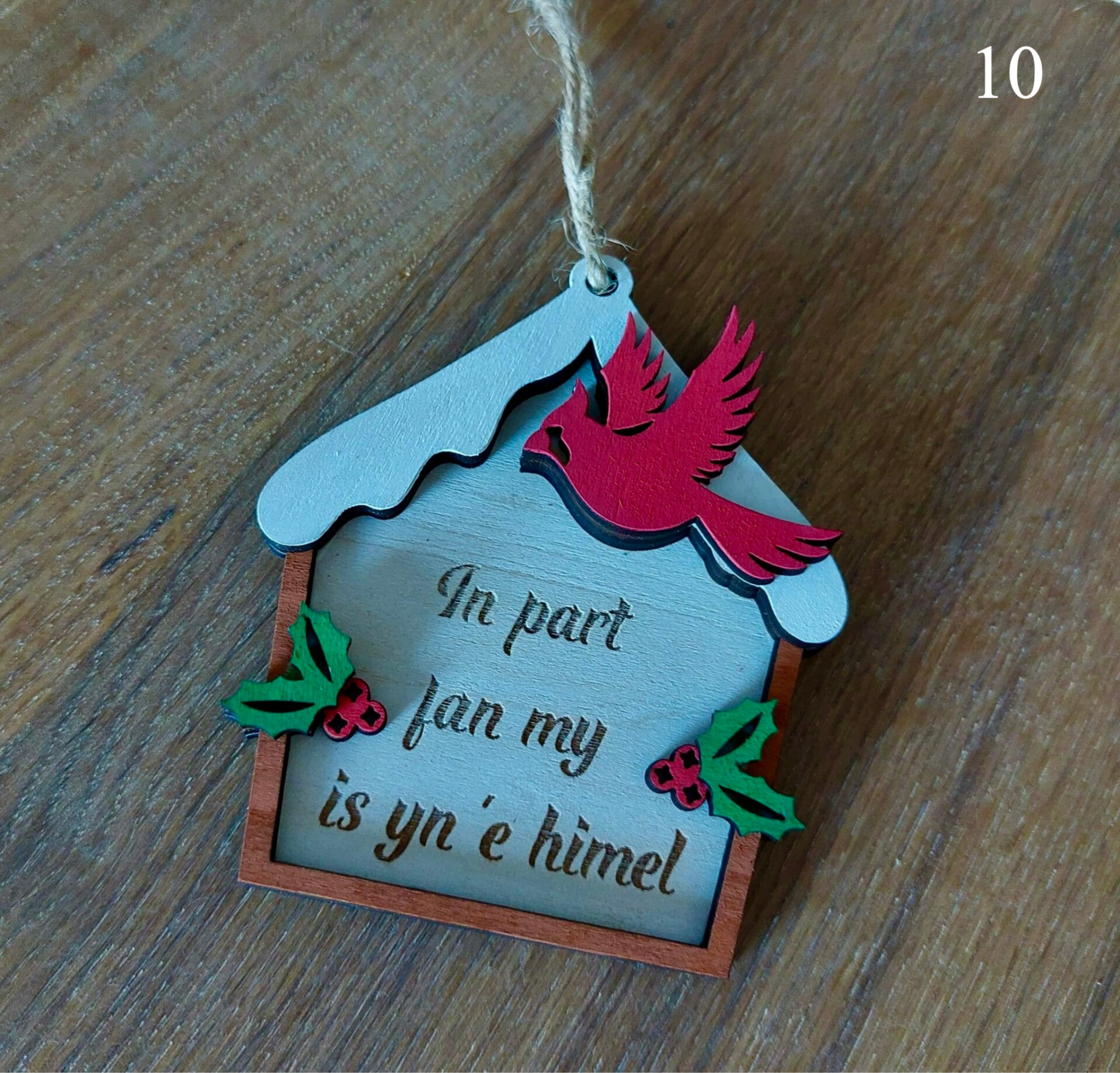De gewenste tekst wordt gegraveerd en is dus in houtkleur. Het ornament kan wel in kleur geleverd worden.