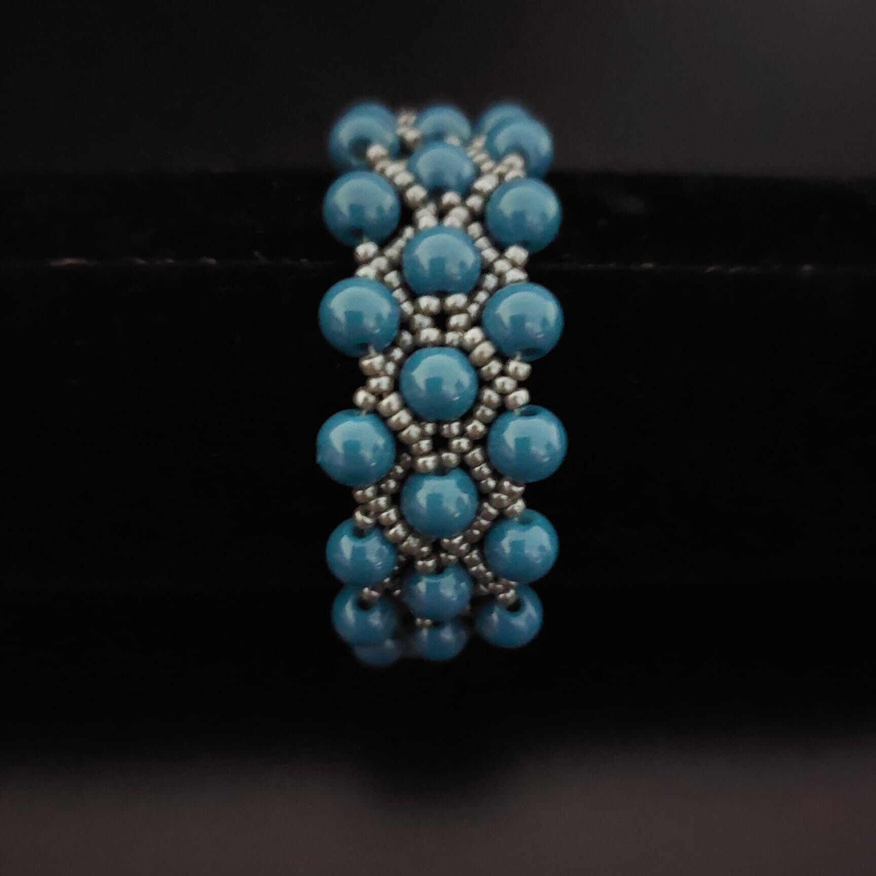 Brede armband met blauwe glaskralen en grijze miyuki rocailles.